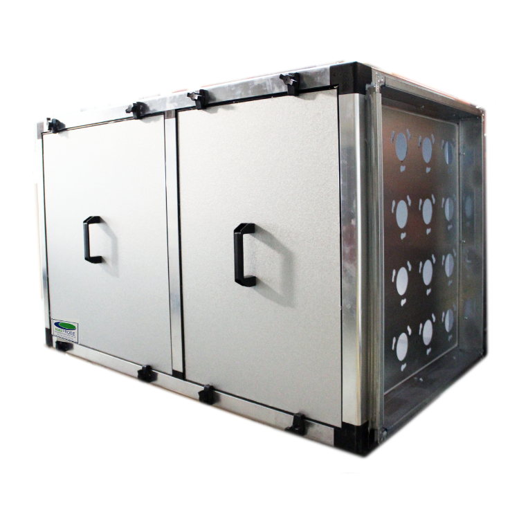 O sistema contém três etapas de filtragem – filtragem mecânica através de pré-filtragem G4, seguida de M5 (EN 779) e finalmente cartuchos de carvão ativado especial que pelas suas características purifica e desodoriza o ar que é extraído de um espaço interior. Tem o benefício de não ter o recurso a nenhum consumo energético, sendo que a sua utilização terá impacto na perda de carga do sistema de ventilação, obrigando, contudo, a recorrer a ventiladores de alta pressão na ordem dos 89/90 m.c.a. O carvão ativado é granulado, para diminuir a perda de carga, e colocado em cartuchos que são fixos a uma chapa por onde o ar atravessa. As suas características criam uma adsorção química que decompõe as bactérias que provocam mau cheiro e contaminantes nocivos no ar, retendo-as nos seus alvéolos. A caixa de revestimento tem uma estrutura em perfil de alumínio anodizado, com painel duplo em chapa e isolamento acústico, plastificado com proteção UV no exterior. Existem três modelos disponíveis: Ambifilter 1, Ambifilter 2 e Ambifilter 3 conforme os caudais e correspondentes quantidades de filtros associados. |